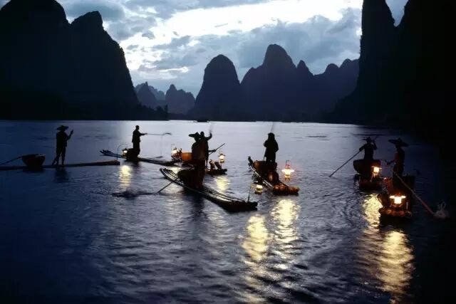 1980年,广西,桂林。傍晚,渔民在漓江上捕鱼。