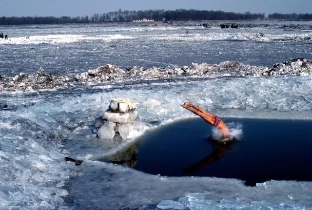 1981年,黑龙江,佳木斯。从11月到第二年的4月之间,许多人在松花江中冬泳。这个人在午餐时间跳进河里,当时水是0度,空气是零下25度到零下35度。