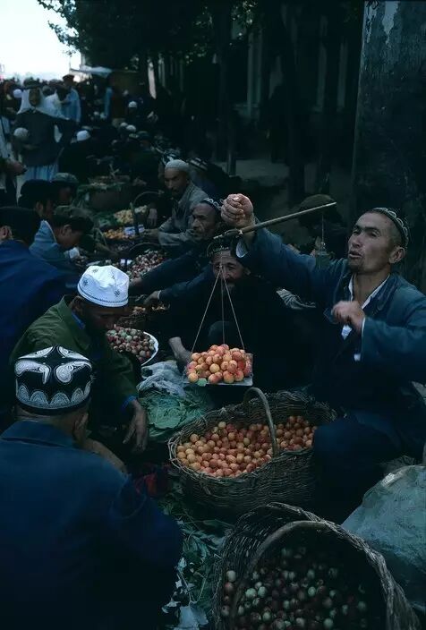 1980年,新疆,喀什。水果市场上有很多水果小贩,你必须讨价还价,才能买到合适的东西。