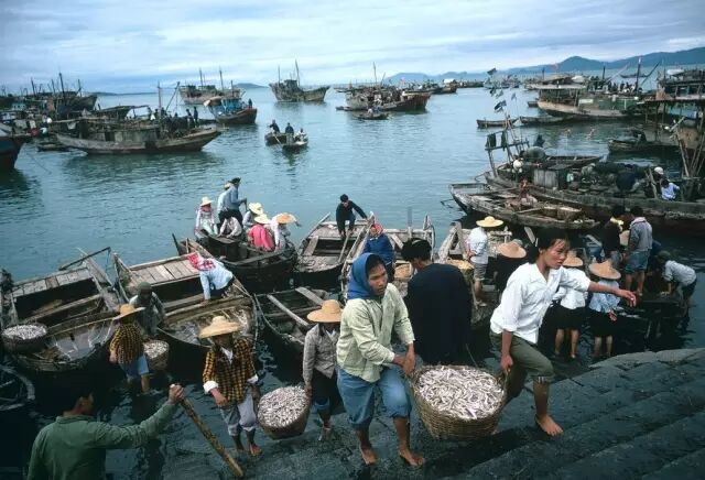 1982年,海南。三亚渔港和海军港口。男人负责捕鱼,而卖鱼等其他工作则主要由女人完成。