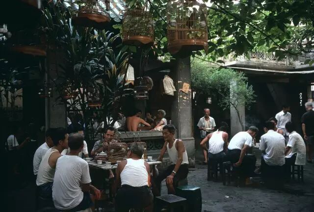 1982年,广东,广州。清晨,人们听着鸟鸣声在茶馆中喝茶、吃点心、聊天。他们都对自己放在竹笼里的鸟感到自豪,听鸟的鸣叫让他们很享受。