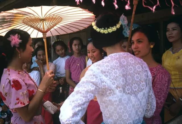 1982年,云南,西双版纳,傣族女孩儿在新年假期撑着阳伞。景洪是一个比较大的城镇,有600000人口,这里有许多打扮精致的年轻女性,她们用伞来抵挡热带阳光的直接照射。