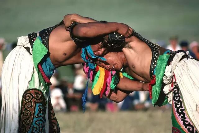 1981年,内蒙古,巴彦乌拉。搏克(蒙古摔跤),参赛选手身穿牛皮或帆布制成的"卓得戈"(紧身半袖坎肩),裸臂盖背。优胜者脖颈上套着五色彩绸制成的"将嘎"(项圈),它是搏克手获胜次数多少的标志,获胜次数越多,"将嘎"上的五色彩绸条也越多。优胜者将获得一匹马、毛毯或电视机。