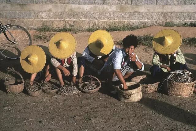 1983年,福建,惠安。惠安位于泉州东北40公里,这个小镇附近的妇女戴着漆成黄色的帽子,穿着露肚脐的短衬衫,看起来非常浪漫。他们在清晨出售贝类。