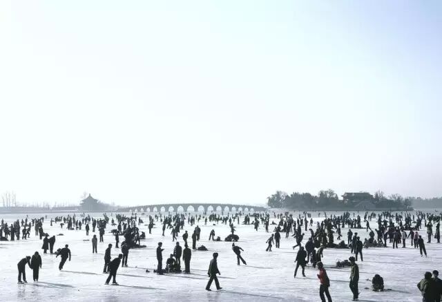 1984年,北京,颐和园昆明湖。人们在结冰的湖面溜冰、打雪仗。
