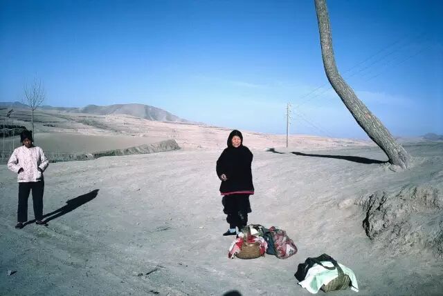 1980年,甘肃。一个老婆婆在荒凉的黄土地上等公共汽车。