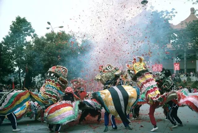1982年,广东,中山。祭祀时的舞狮表演。有趣的是,中国北部和南部狮子的颜色并不一样。