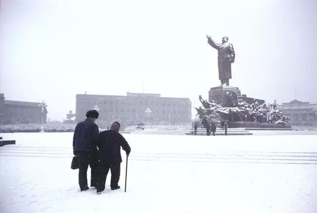 1981年,辽宁,沈阳。大雪天,一位母亲在儿子的搀扶下走向毛泽东的雕像。