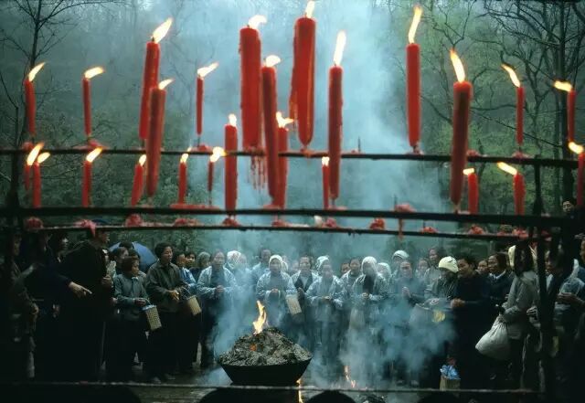 1983年,浙江,杭州。人们在春分后第十五天到寺庙祈祷,其中大多是老年人,有时甚至会遭到年轻人的嘲笑。他们先点红蜡烛,烧竹草纸,然后再把手放在一起,背诵几句祷告。