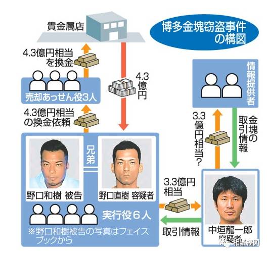 去年7月,在日本福冈市的JR博多站附近的路边,发生了一起多名男子伪装成警察盗窃金锭的事件,总案值约为6亿日元(约合人民币3700万元)左右。就在当时福冈警方已经锁定6名实行犯。在事件发生后一部分金锭被转卖,随后警方又逮捕涉嫌斡旋销赃的3名男子。