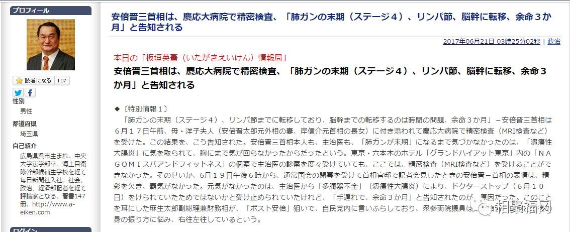 从22日下午开始,日本网络上开始流传安倍得了肺癌还是晚期这一惊天消息。而这则消息来自一位自由记者板垣英宪发表的博文:首相安倍晚期癌症(4期),已经转移到淋巴关节,转移到脑部只是时间的问题,所剩生命只有3个月。