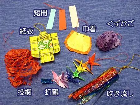 ●纸衣-祈求灾难与病魔的远离,还有缝纫手艺的进步。通常挂在七夕竹的最上面,象徵织女所织的衣服,也是对神的祭品。
