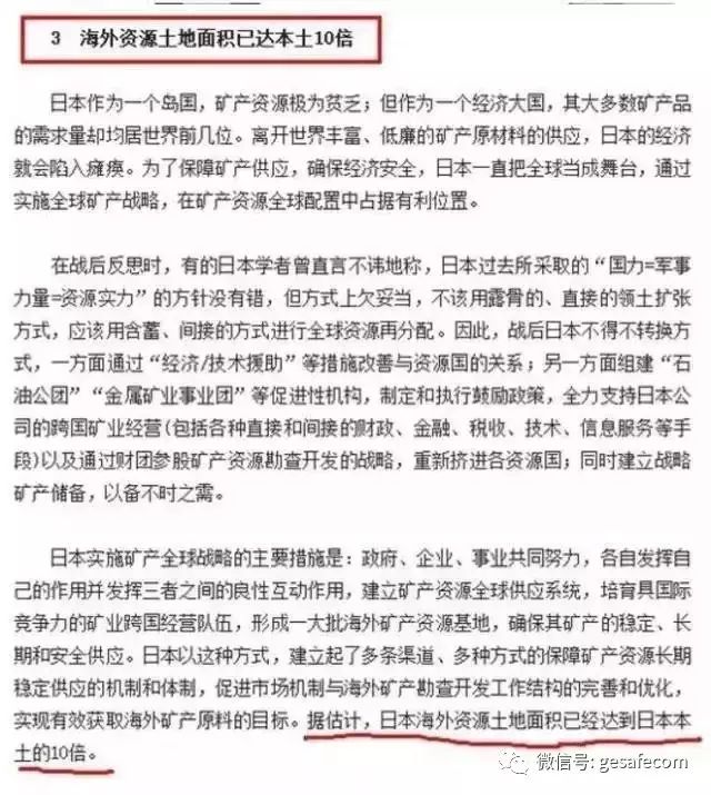 日本资源匮乏,所以日本必须在海外寻求资源,到目前为止,日本海外的资源面积已经达到本土的10倍——矿山,石油这些基础原料就是资源面积!