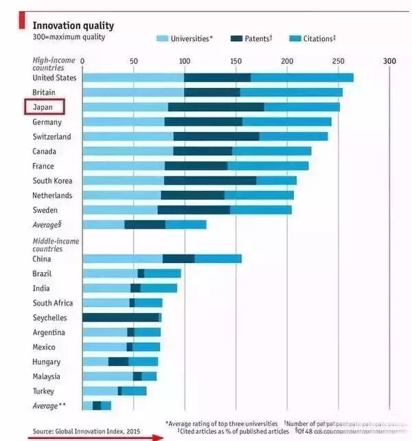 《Economist》发表2015国家创新质量(Innovation Quality)报告,日本位列世界第三。创新质量的意思,就是你的创新到底有没有为经济的发展做出贡献——更能体现一个国家的创新实力: