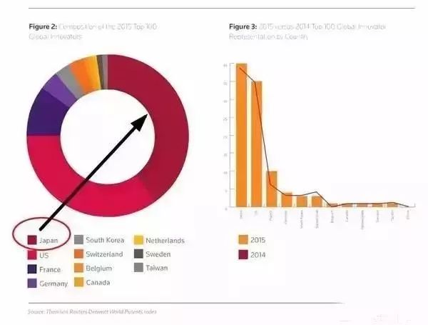 在2014年之前一直是美国第一名,2014年之后被日本超越。从这几年的报告中我们可以看出,日本的创新已经发生巨大变化。日本其实早就抛弃已经沦为低端制造业的家电之类产业,转变为全力投入BtoB,新材料,人工智能,医疗,生物,新能源,物联网,机器人,高科技硬件,环境保护,资源再利用等新兴领域。