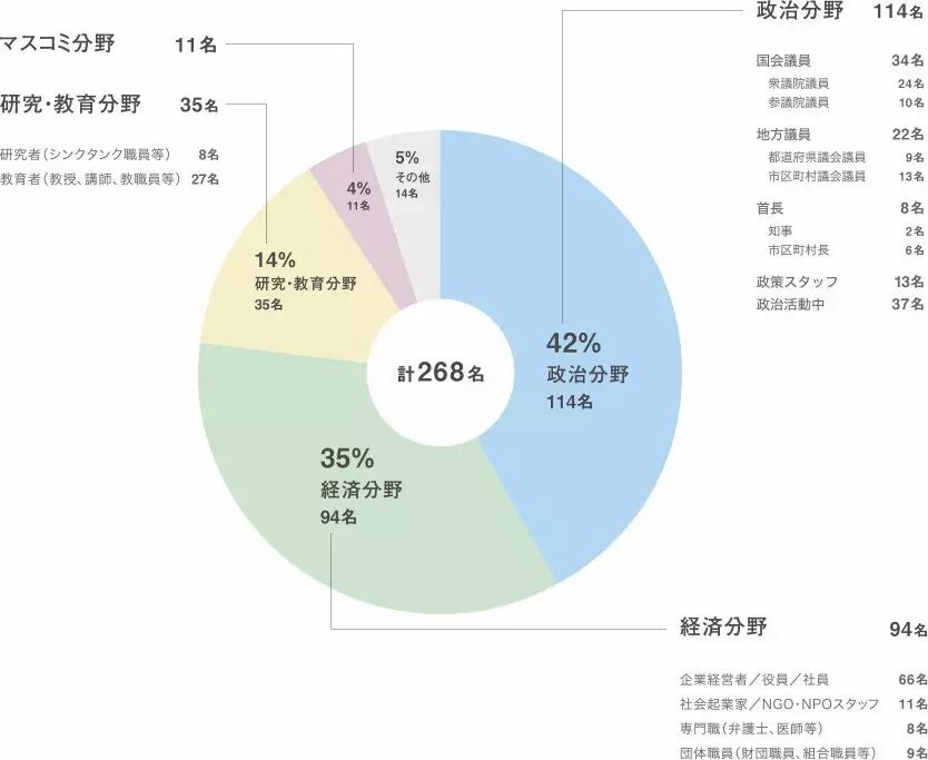 目前,松下政经塾一共有毕业生268人,114人从政(占比42%),占有日本国会参众两院34个席位,22个地方议会议席,宫城县知事、滋贺县知事(县知事,大约相当于中国的省长)等8个地方首长职位。