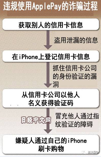 在通过ApplePay使用信用卡之际,在商家的读取设备上扫一下手机即可完成指纹识别。与输入密码相比,指纹看起来更加可靠,但仅确认与手机上登记的指纹是否一致。如果犯罪者的手机登记了他人名义的信用卡信息,将无法起到防范作用。