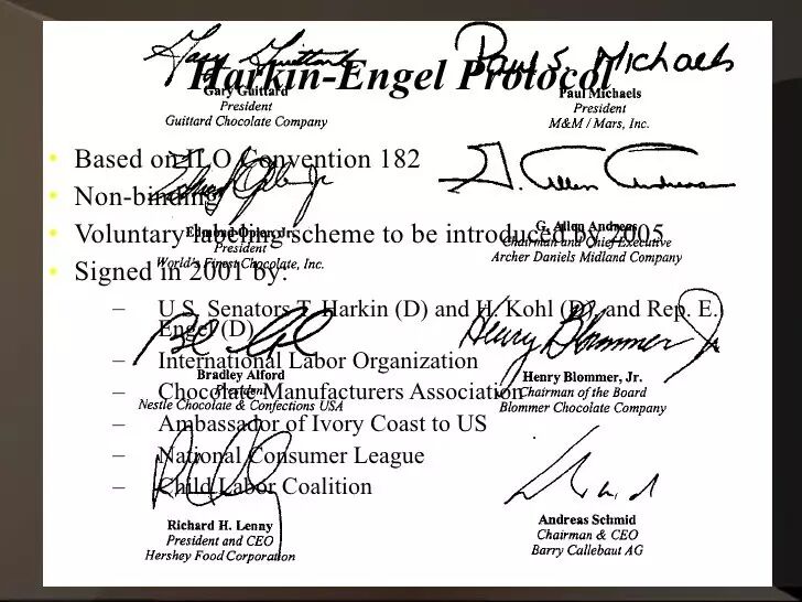 2001年,包括雀巢、嘉吉、卡夫在内的多家知名巧克力工厂签订了《哈金安格定义书》(Harkin-Engel Protocol),希望在2008年前消除剥削童工与儿童贩卖的问题。但作用微乎其微,期限不断被延后。
