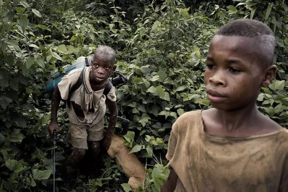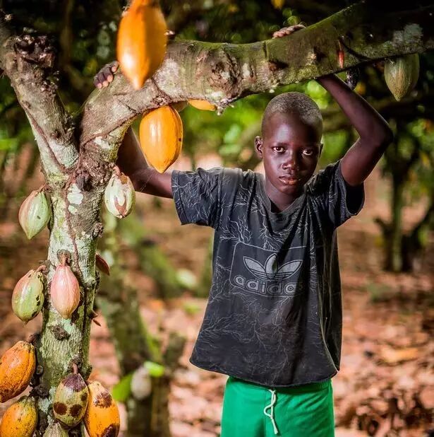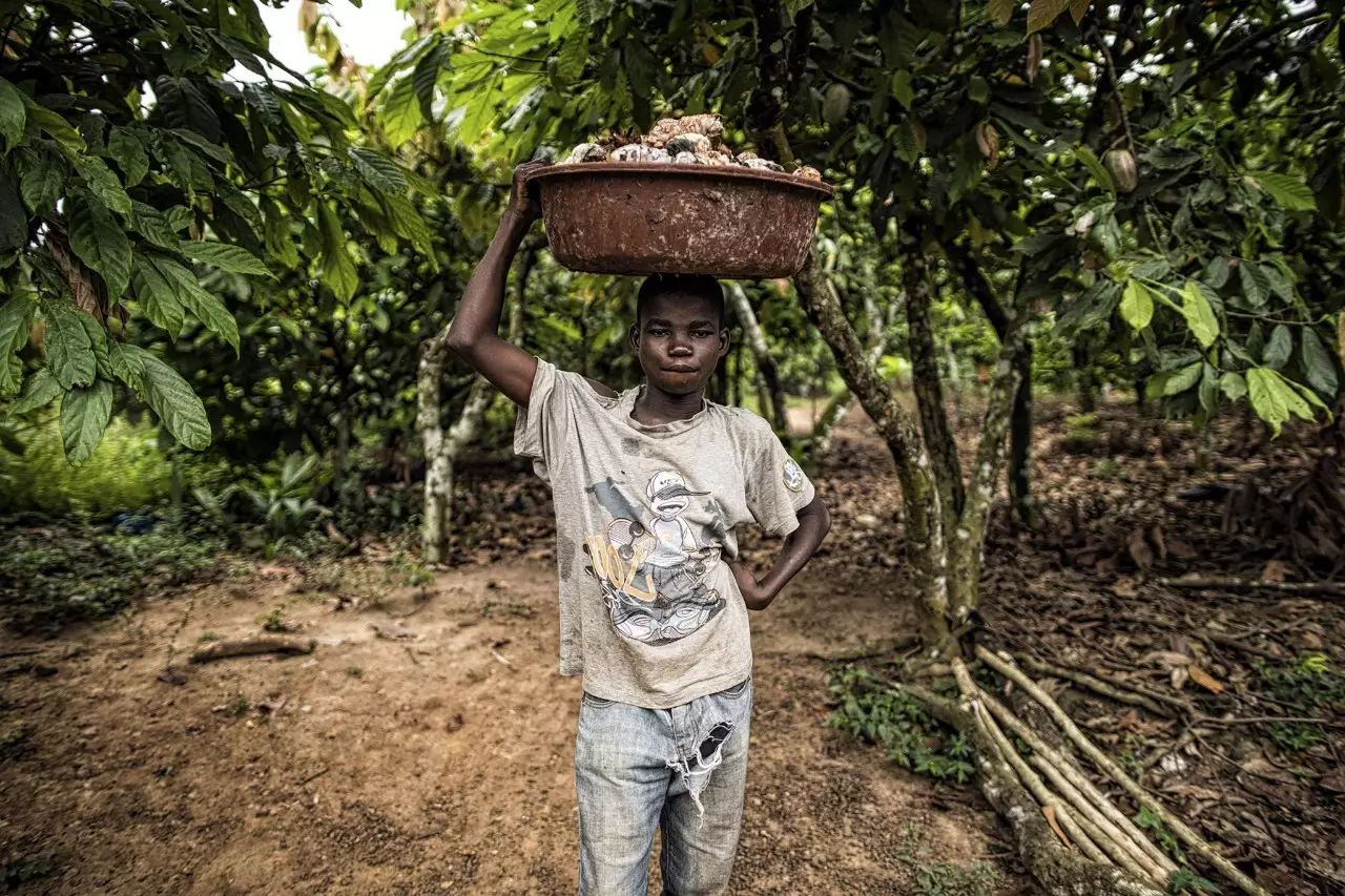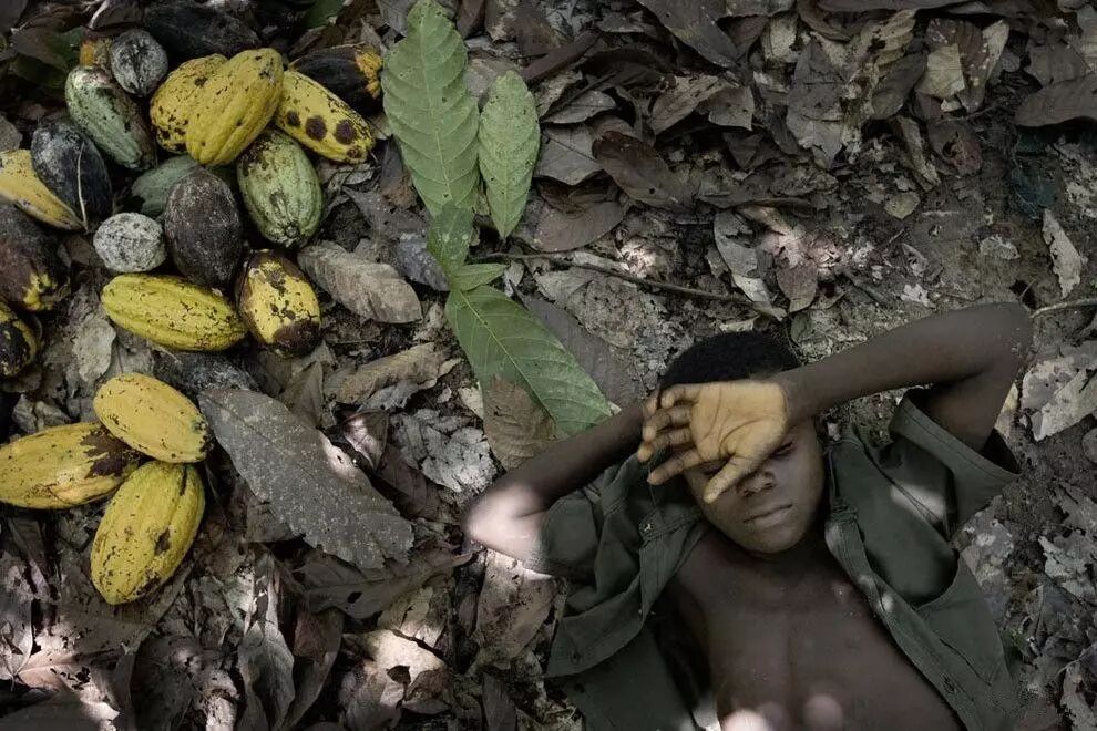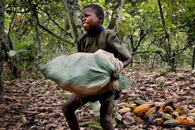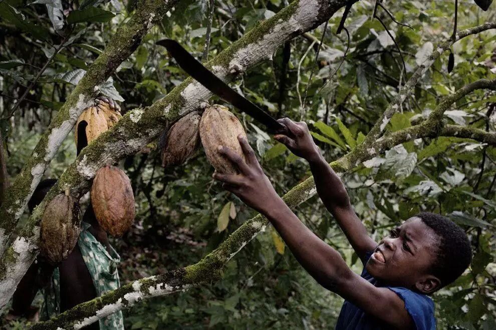他们从事高危辛苦的劳作,用砍刀收割可可豆,在身体还未发育完全时吃力地搬运比他们还重的一袋袋可可豆。