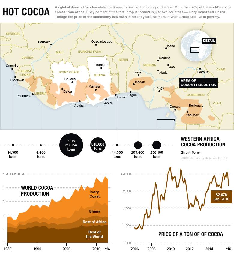 近15年来,全世界大型巧克力制造商均承诺要帮助解决象牙海岸乃至整个西非非法使用童工的现象,并为此不惜花费数千万美元。但据最新数据统计,目前西非仍有210万儿童在近似奴隶的状态下从事体力繁重的可可豆收割工作。