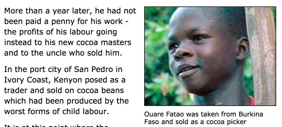 在加纳的村庄,记者Kenyon见到了12岁的Ouare Fatao Kwakou,他被叔叔卖给了人贩子,再由农场主买回去采摘可可。