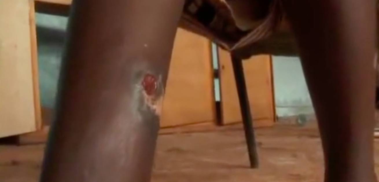 肥大的T恤挂在她瘦弱的身上,腿上的伤痕清晰可见,