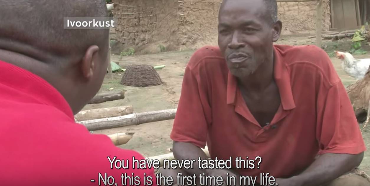 一位农民兴奋的拿着记者带来的巧克力分给正在农作的村民,不少人从未听过巧克力到底是什么东西。