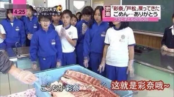 过一天,孩子们被带到食堂,老师冷酷的指着宰杀好的猪肉,告诉他们:“这是“彩奈“哦。(孩子给猪取的名)”