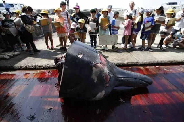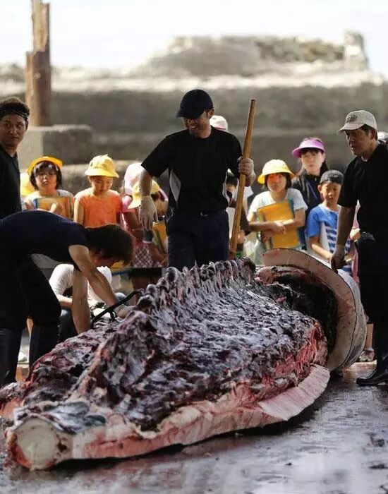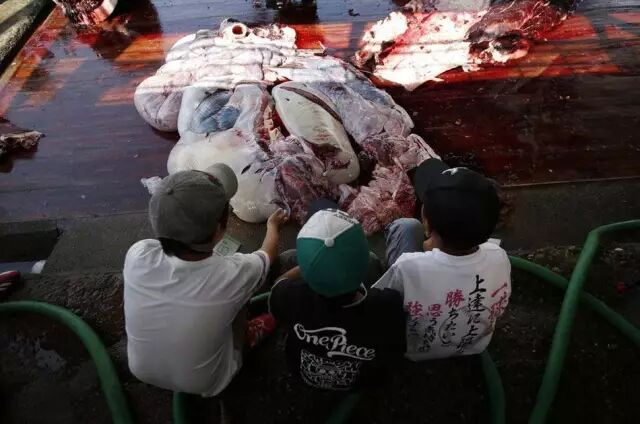 孩子们目睹宰杀、分割鲸鱼的全过程。日本人不顾国际舆论谴责坚持捕鲸,连杀鲸鱼都从娃娃抓起。