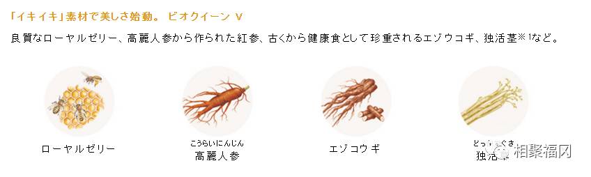 Bio Queen 黄色的功效是补气,气是人体各项机能正常运转的动力源泉,如果你出现容易疲惫、注意力低下、容易陷入紧张情绪、失眠或者感觉皮肤缺少弹力、老化等现象,那就是却气。健美三泉中黄色的主要成分是蜂皇浆(含有22身体不可缺少的22种氨基酸蛋白质以及其他40多种营养成分)、红参(与高丽参同科植物的根部抽出的精华)和《本草纲目》中摘录的刺五加,这些都是自古以来用于补气的高档补品。这几种成分能够有效提高肌肤的弹性、睡眠质量、改善气虚体弱,使身体生理机能大幅提高,气色明显好转。