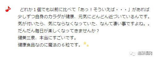 健美三泉完全是根据中医的思想,通过补气、血、水三方面来帮助女性调节身体机能平衡,由内而外养生养肤。我看了很多日本妹子博客等的评论,说坚持吃健美三泉之后的改变是明显能感觉得到看得见的。皮肤是由内而外自然散发的光泽,与用昂贵的面膜后皮肤的变化感是不同的,气色也有明显好转。
