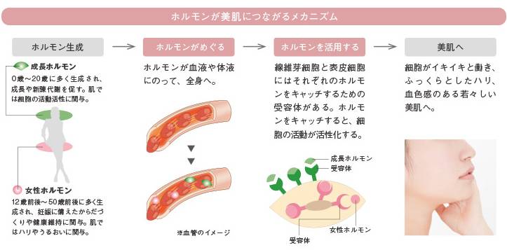 POLA的科研人员带着这个疑问对【荷尔蒙和肌肤细胞的关系】进行研究。他们发现纤维芽细胞和表皮细胞里面都有荷尔蒙受容体。这些受容体抓住了荷尔蒙,皮肤细胞就活化了。所以皮肤就会变得嫩白。这才是返老还童的原理所在。