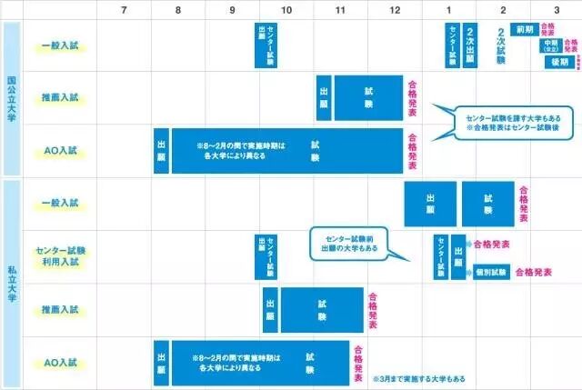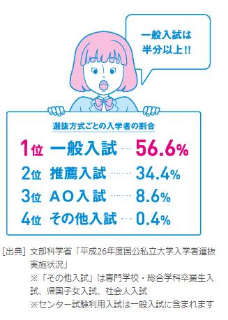 “一般入学选拔”是以考试成绩为侧重点,是国立大学录取新生的主要方式(我们整篇文章在说的正是“一般入学考试选拔”的相关内容),它分为三类:加入中心考试的一般入学考试(需要参加中心考试和个别学力检查);免除中心考试的一般入学考试(大多数私立学校多采用此法);部分参加中心考试的一般入学考试(虽然参加中心考试,但考试要求比普通学生要低)。