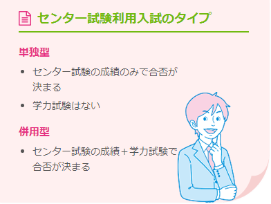 因为官方并没有统一规定中心考试和各大学的个别考试间的组合,所以各大学的招生考试呈现出灵活多样性。利用中心考试的大学包括所有国立大学和公立大学以及部分私立大学。