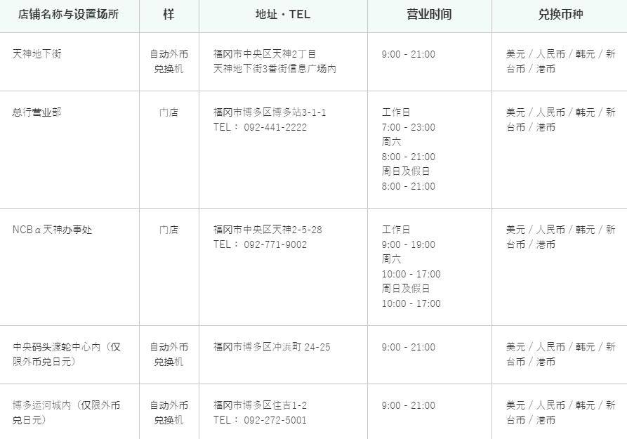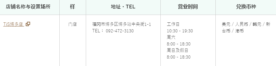 营业时间:8:00〜21:30 电话:092-473-2518 地址:福冈市博多区青木739 福冈机场国际候机大楼1楼 对应语言:日文,英文,中文,韩语