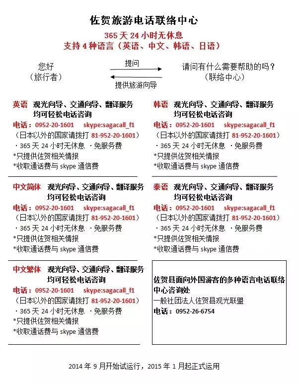 2.从2015年开始,佐贺已经有相关的旅游中文电话服务中心。可以24x365天全方位提供中文服务。