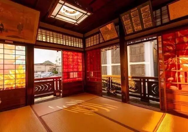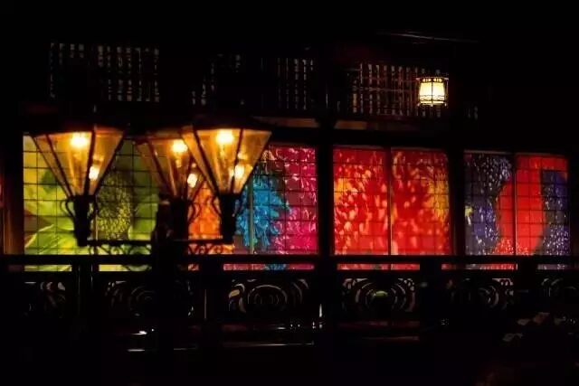 古老的道后温泉本馆窗户上,装饰上繁花似锦的蜷川摄影作品,华灯初上,迷人非凡。