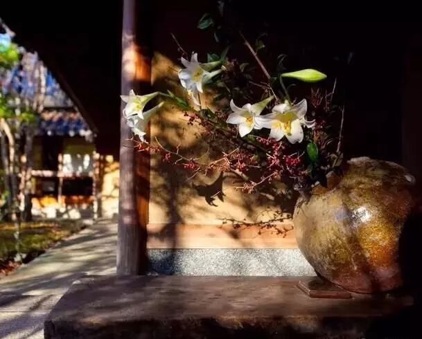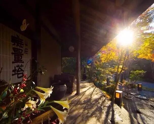 旅馆“无量塔”似乎有一种淡淡的禅意,散发着古朴的神韵。门廊上整齐地堆放着一根根树枝,另一侧的落地花瓶里插着无名小白花,当你走进无量塔,才会意识到古朴门廊与背后考究的温泉旅馆是那么协调。