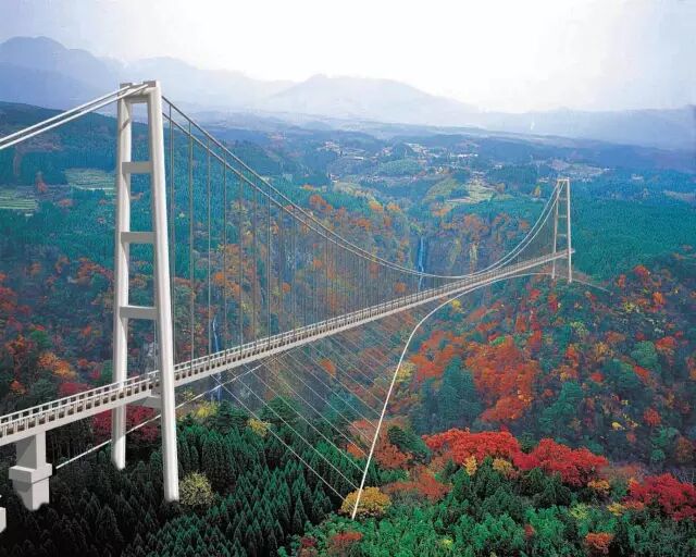 九重梦大吊桥长390米,高173米,是日本最长和最高的人行吊桥。站在桥上可以领略“日本瀑布百选”的“震动之瀑布”雄伟壮阔,还能远眺远方的火山。流淌于脚下的九醉溪则在阳光下泛着层层金鳞,通透清新。当地人用14年时间建了这座观光人行吊桥,并给它起名为“梦”,可见他们是希望这里的四季美景能经由这座“梦之桥”分享给更多人。