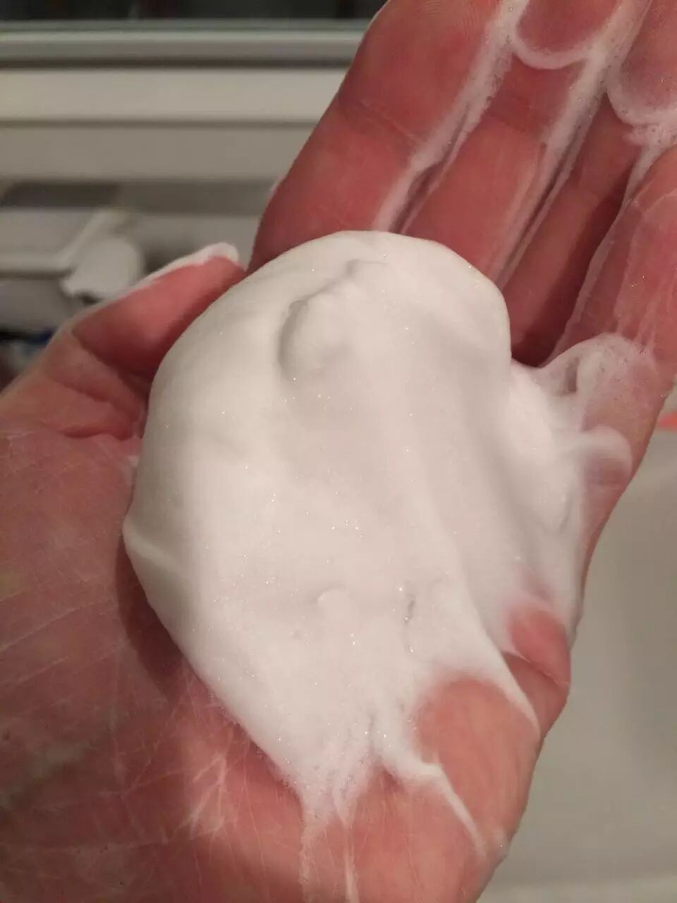 因为两只手搓出来,另外一只手还要洗掉擦干净拿手机拍照,所以损失1/3的泡沫。这么浓密的泡沫扑在脸上感觉很柔软,很嫩滑。