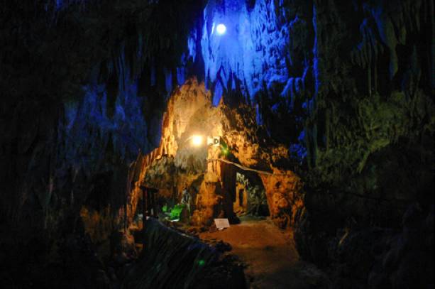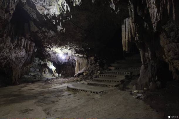与论岛,是珊瑚礁隆起而形成的岛屿。大地受水流侵蚀,经年累月下便形成了著名的赤崎钟乳洞。一滴一滴水侵蚀而成的神秘地形和光辉,令人叹为观止。洞内有“幸福之门”、“雪之棚田”、“剑之间”等,都是大自然的鬼斧神功,令人眼花缭乱。