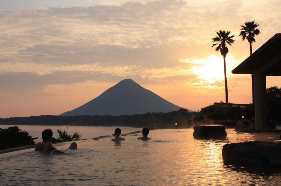 指宿名物沙蒸温泉以及因为鹿儿岛的当地美食出名的温泉保养设施,最人气的露天温泉的海边景点。指宿的人气景点。可以远远看到屋久岛,而且可以看到锦江湾落下去的夕阳,而且这里是日归温泉以及spa部门4年连续第一位的绝境露天景色。