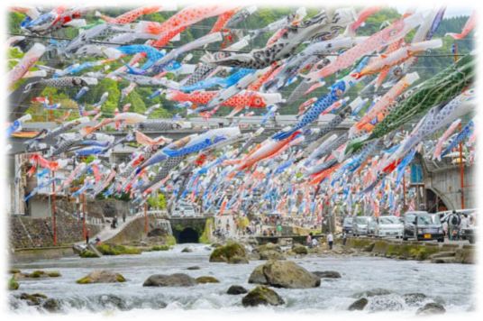 在每年春天 4月1日〜5月6日的杖立川的上空有3500条锦鲤旗,在春风的吹拂下好像和在游动一样。杖立温泉也是熊本县东北部小国町十分优质的名温泉。这里晚上(19-22点)有灯光照射,还可以看到和白天不一样的奇幻的景象。