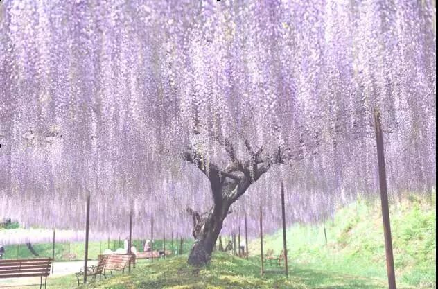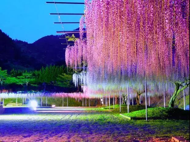 到了夜间会被照明点亮,紫藤花成串的如同瀑布倾泻而下,长达一米半左右的藤花还飘着香甜的气息。