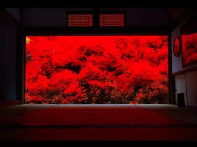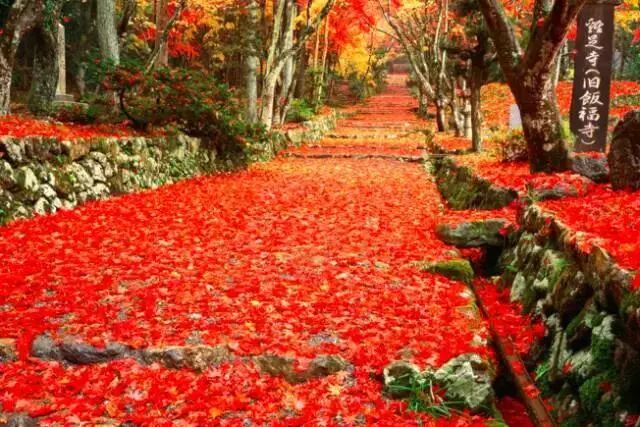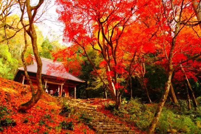 每年从十一月中旬到下旬,以两百株枫树为主的古木都变化色彩,把静谧的山寺染得活色生香。