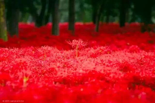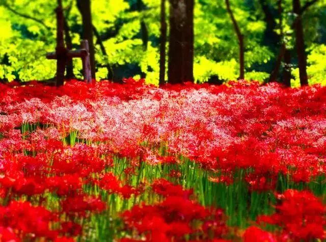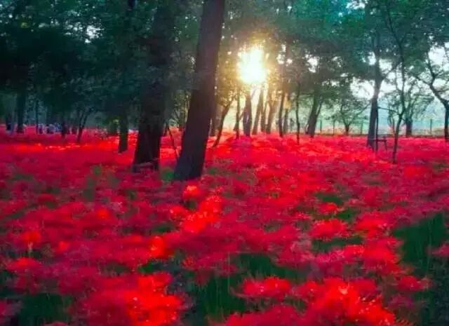 林中也开满了彼岸花,妖冶得不可方物,花中有一条暗藏的小径,行走在绿叶漏日彼岸红花中,少有的赏花体验一定会让你难忘。