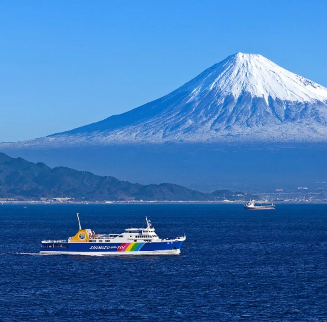 骏河湾是指以伊豆半岛尖端的石廊崎和静冈县御前崎市御前崎作为两端点连线以北的水域,也是日本最深的海湾。以“富岳三十六景”之一的“骏河湾渡轮”而知名,乘坐渡轮上海,可以更清楚地看到富士山山麓坡度平缓的原野,视角独一无二。