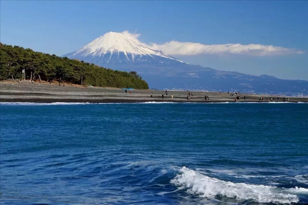 在三保松原七公里长的海岸线上,生长着5万4千棵松树的松林,以富士山为背景,黑色的沙滩,白色的浪波,蓝色的大海构成了一幅美丽的风景画。