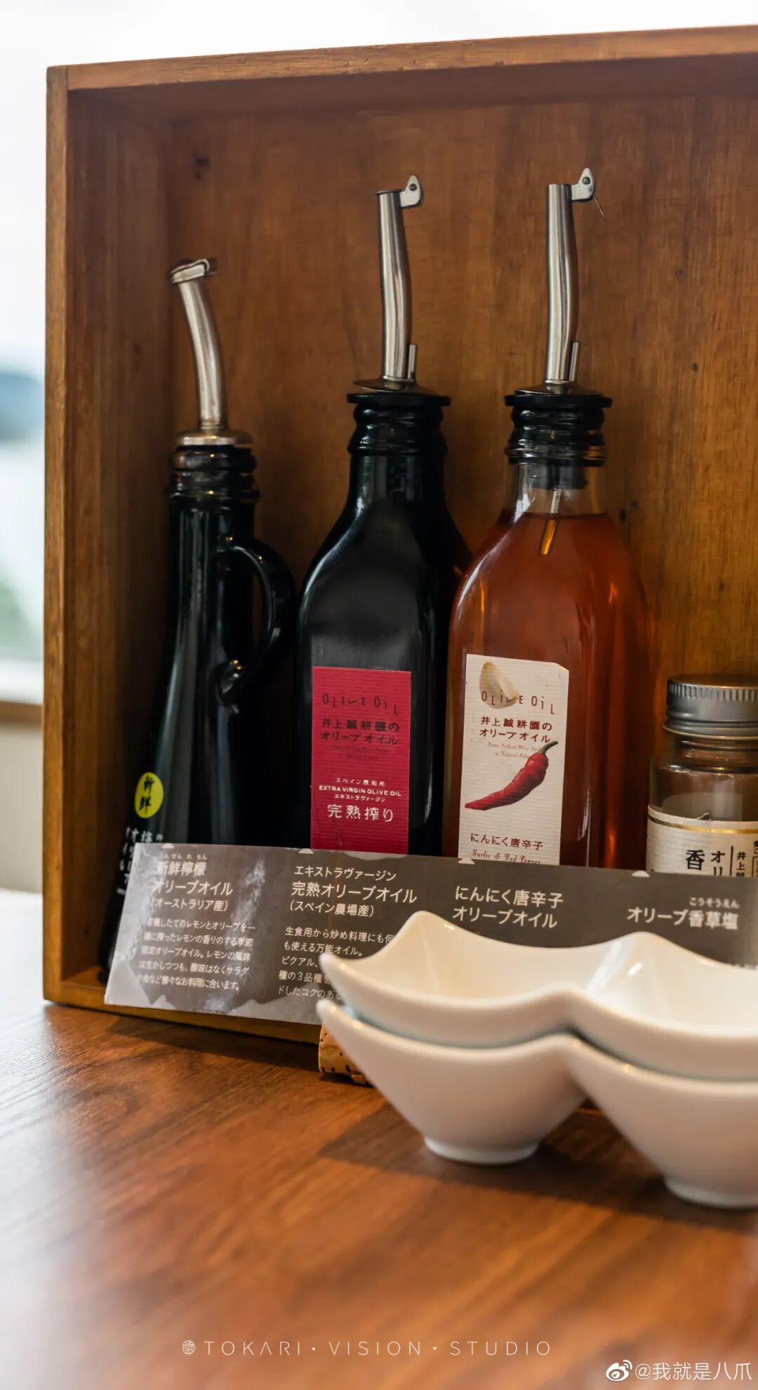 桌上提供有自家农园橄榄制作的纯天然橄榄油。价格不贵,味道极赞,遇到喜欢的口味,还可以在餐厅商店中购买带回家。