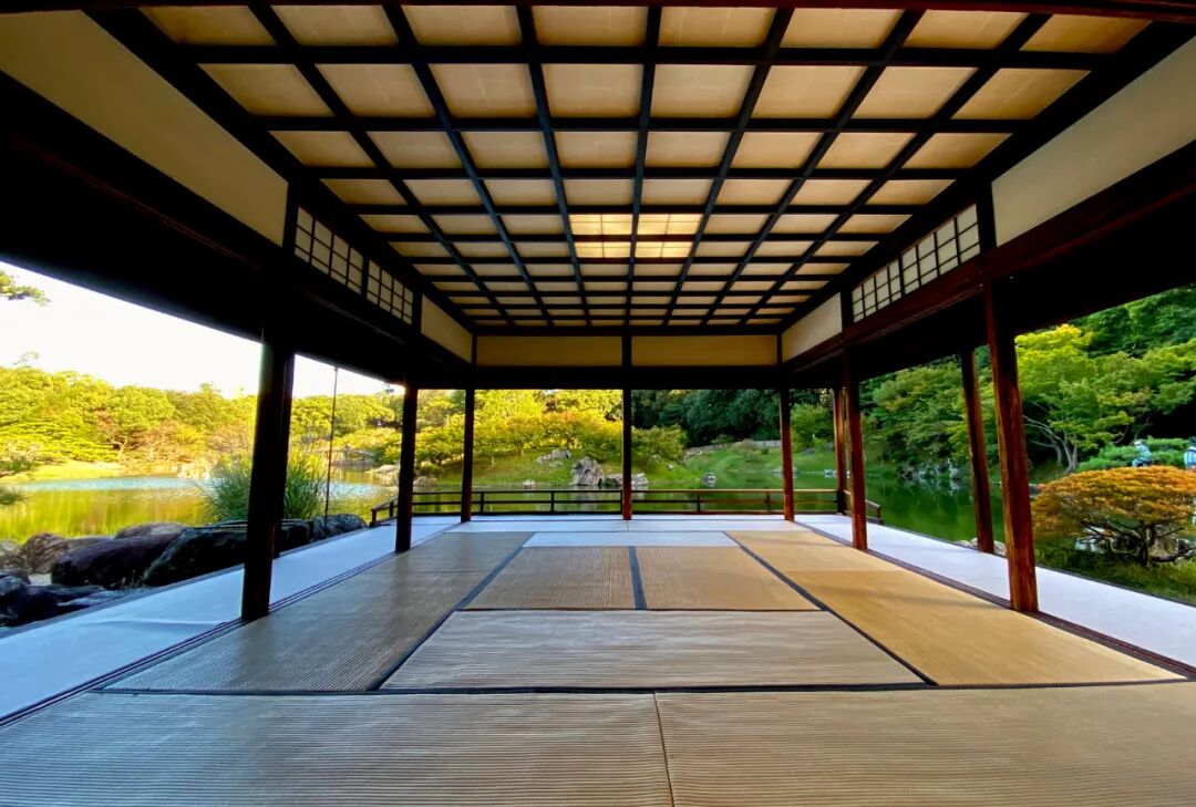 这间茶屋没有设置玄关,从任何地方都能够进入,可以说房间的每一面都是屋子的正面,是罕见而有趣的建筑设计。在掬月亭,边吃茶,边欣赏庭园,也是充满雅趣。
